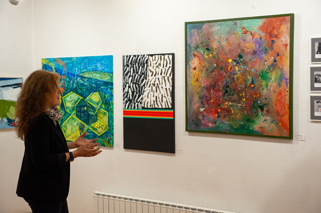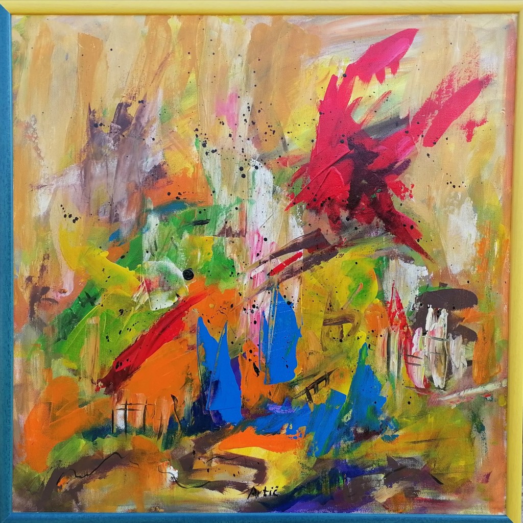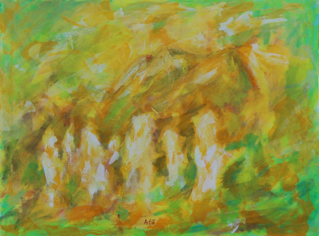 Skupinska razstava povabljenih slikarjev, Anina galerija v Rogaški Slatini. Rumena slika iz serije gestualni expresionizem, 80×100, olje, 2022